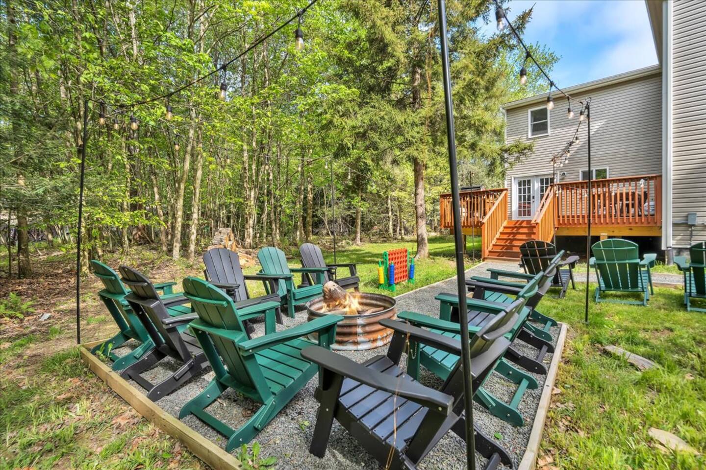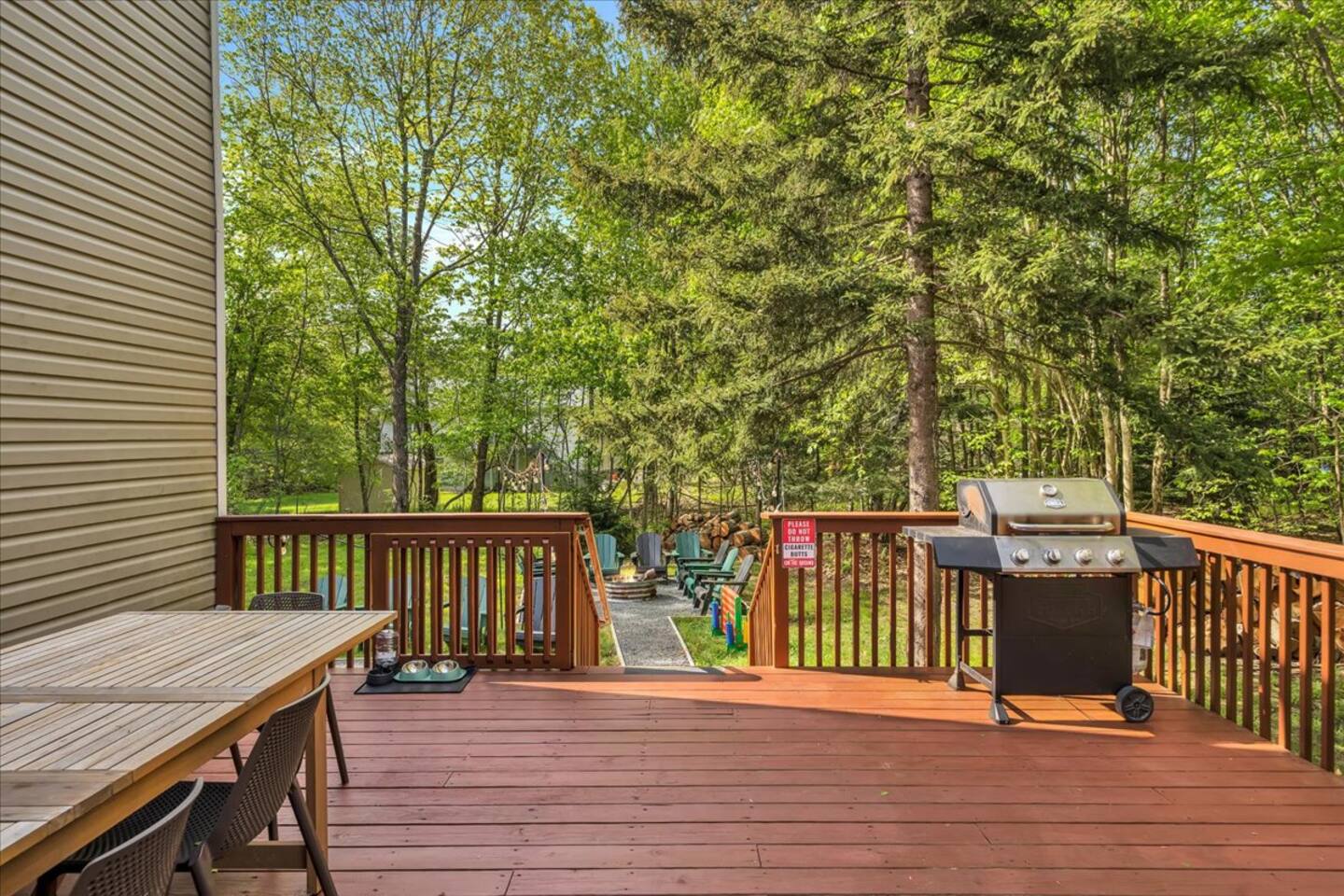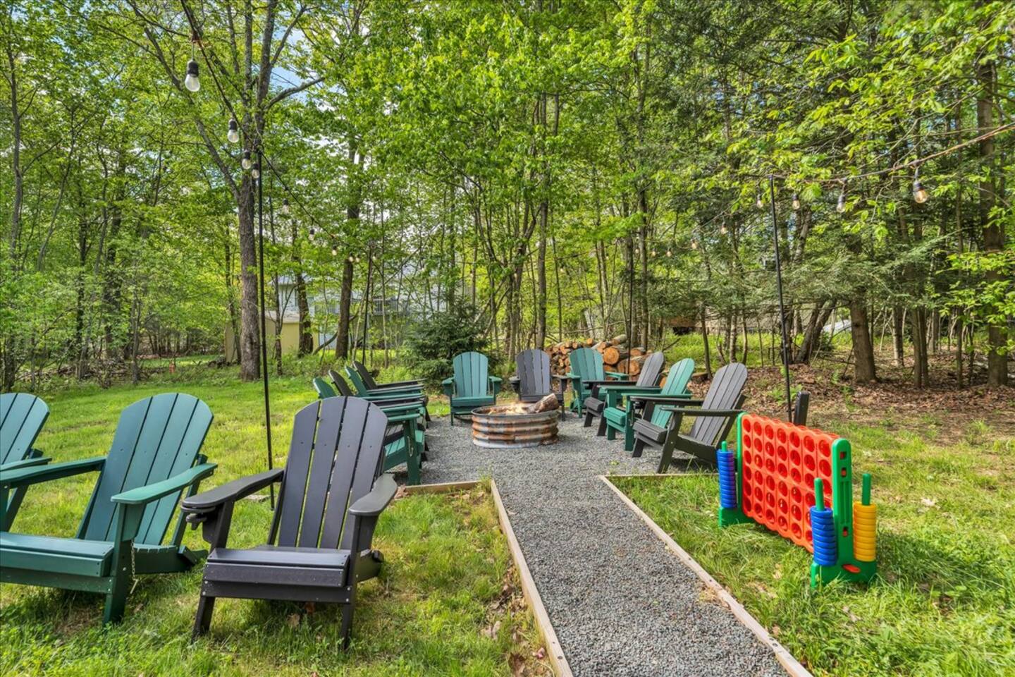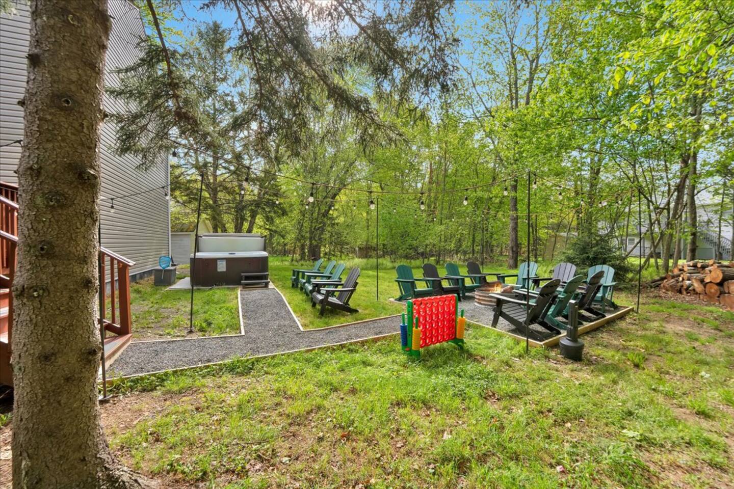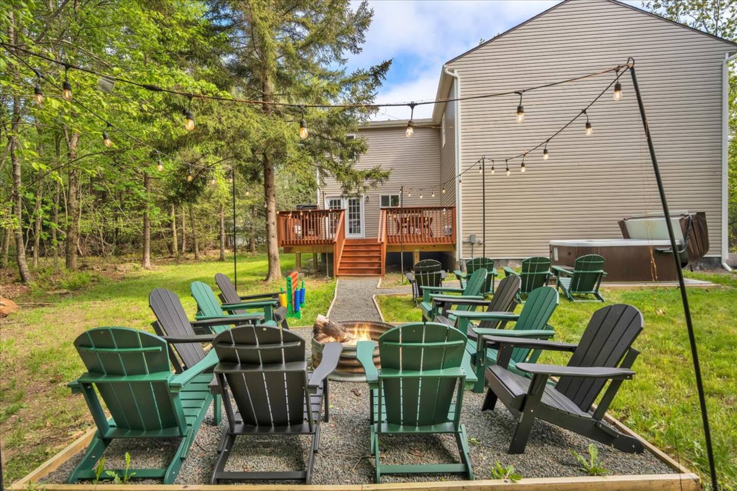 KEY FEATURES: ☀ Sleeps 14; 5 bedrooms, 1 King, 4 queen, 2 twin ☀ 2 Bathrooms; 1 full with combo shower/tub, 1 with shower only ☀ Well-equipped kitchen with seating for 12 guests ☀ Smart Tv systems throughout the home ☀ Board games and puzzles ☀ Dog-friendly ☀ Gorgeous forest views ☀ Back deck with grill ☀ Private outdoor hot tub ☀ Fire pit with some wood provided ☀ Short distance to Pocono Mt. attractions ☀6 miles from Jack Frost, Big Boulder Ski ☀13 miles from Kalahari ☀17 miles from Camelback Ski Resort ☀7 miles from Pocono Raceway *Please note- there is a private hot tub at the house. Due to consistent, sub-freezing temperatures in the area, the tub may not be able to be used. We apologize for any inconvenience but refunds will not be offered if hot tub is not functioning correctly.* ☆☆ BEDROOMS ☆☆ This clean and spacious hideaway accommodates up to 14 guests in 5 bedrooms The primary bedroom is fitted with a King-size bed. There are two bedrooms that have 2 twin sized beds in each and two more bedrooms that have queen sized beds. All bedrooms are located on the second floor of the home. There are linens, extra blankets, and extra pillows so you don’t have to bring a thing with you to have a super comfortable night’s sleep! Please note: while the house sleeps 14, be mindful of bed sizes and be sure that the set up is appropriate for your group. TVs in the primary bedroom as well as the kids' room. ☆☆ BATHROOMS ☆☆ There are two full bathrooms and one half bath, each of them stocked with the essentials you need for the duration of your stay. The half bath is on the first floor and is located right off the living room. The second bathroom is on the second floor and has a stall shower only. The third bathroom has a shower/tub combo. We provide a hair dryer, shampoo, conditioner, & body wash in each bathroom. There are also plenty of towels so you don't have to pack any! ☆☆ KITCHEN ☆☆ The kitchen is fully equipped with all the appliances, utensils and cookware you need to feel at home. The dining area seats 12 guests at the retro, mid-century modern table and there is additional seating available for larger groups. We even have a high chair for our smallest guests to use! Enjoy your morning coffee or tea with our fully-stocked coffee bar. ☆☆ OUTSIDE SPACE ☆☆ The exterior area of this home boasts a cozy fire pit with plenty of space for you to relax around. The back yard is large enough to bring everyone out to enjoy the beautiful Pocono outdoors! The backyard is now fully fenced in! There is a large back deck with a table for you to have plenty of space to make yourself at home. The best part? There's a hot tub right off the deck for you to enjoy during your stay! Use our grill and make great memories hanging out at the house. ☆☆ THE COMMUNITY☆☆ Pool Access: There is a heated community pool available. You need a guest pass and must register with the pool attendant. 11am–7pm Beginning weekends at Memorial Day and daily after June 21. The cost is $5 per person per day for ages 14 and up. Children under 14 must be with an adult. Cash payments only. Use of community amenities is not guaranteed. Amenity availability is determined solely by the community/HOA and may change without notice. No refunds or discounts will be provided if amenities are unavailable during your stay. This home is located in a community with full-time residents. We aim to be respectful neighbors and kindly ask that you do the same. Quiet hours will be strictly observed and enforced. After booking, we will ask you to complete and sign a guest registration form that includes your vehicle information and the names/ages of all of your guests. Maximum amount of guests is 14 (over the age of 1-no exceptions can be made.