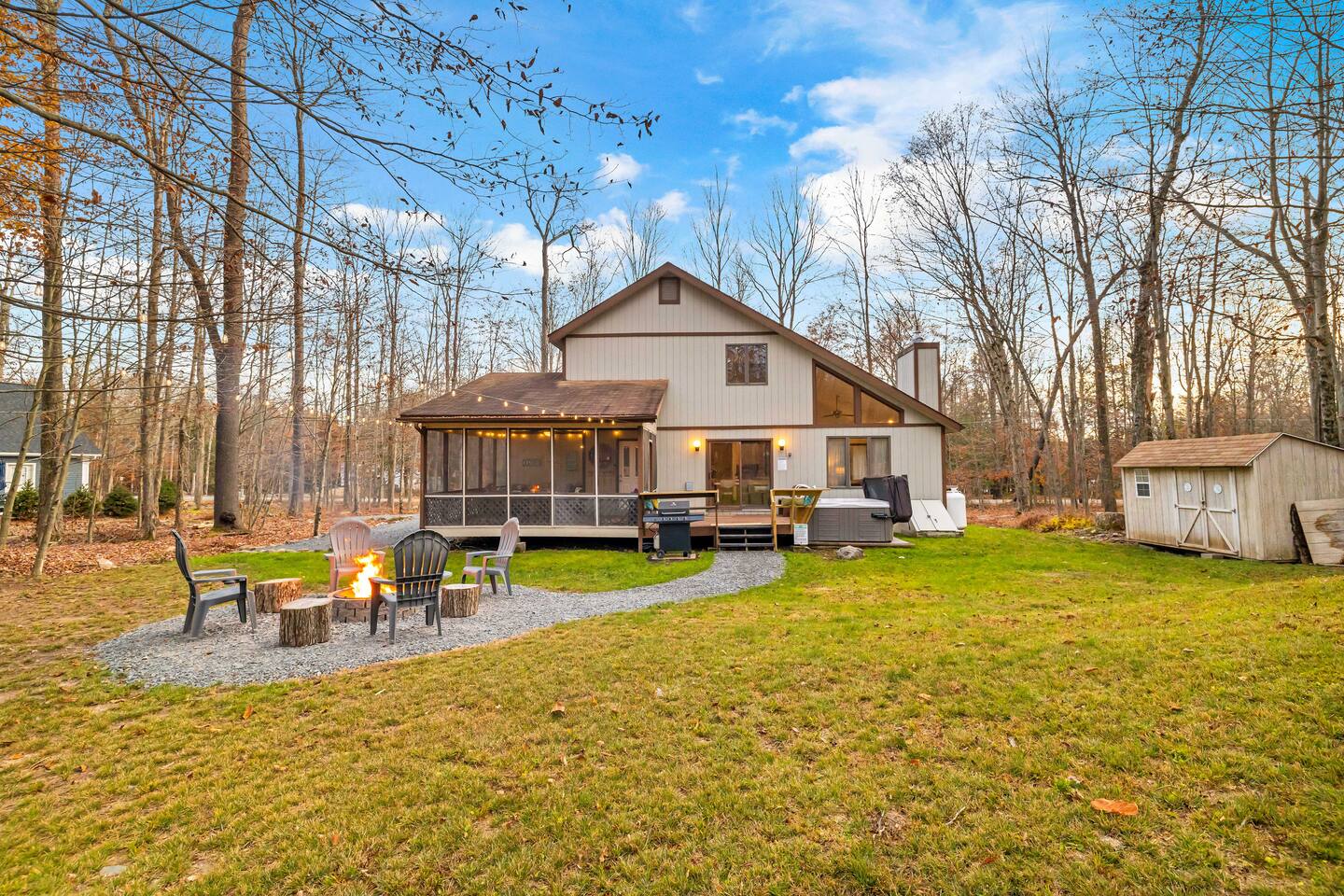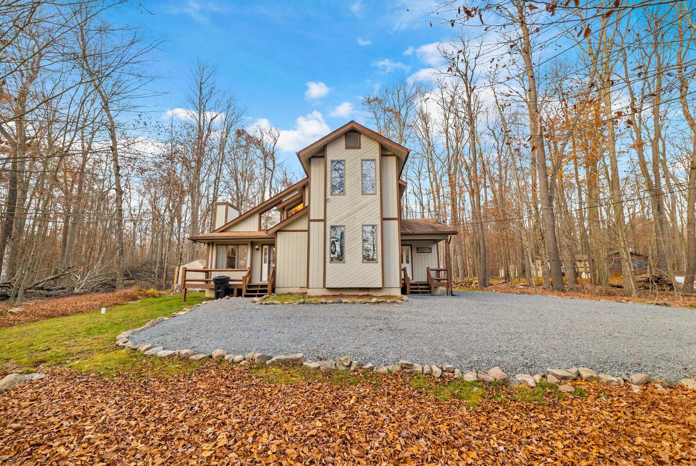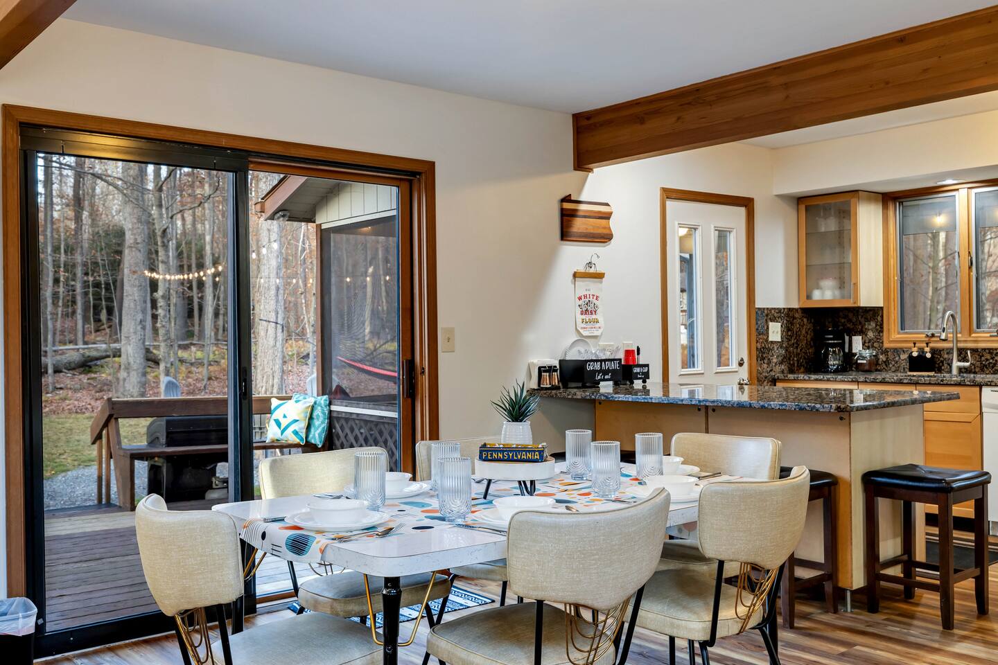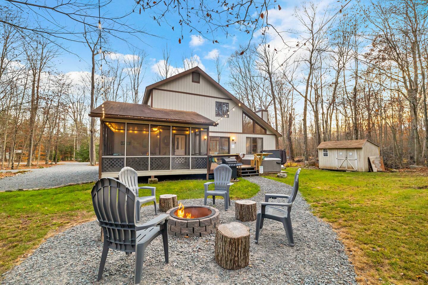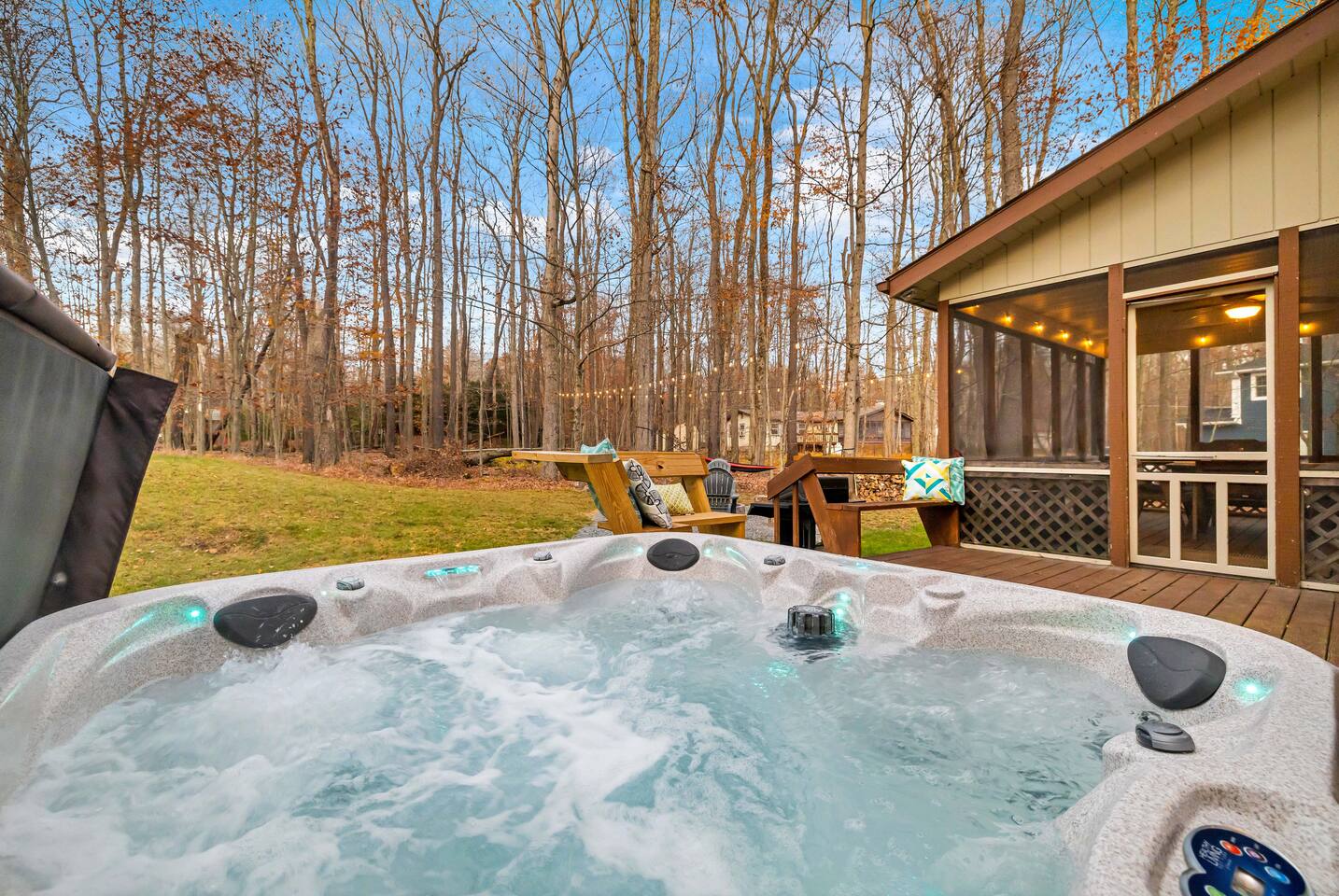 KEY FEATURES: ☀ Sleeps 8; 3 bedrooms, 2 queen, 4 twin bunks ☀ 2 Bathrooms; 1 full with combo shower/tub, 1 with shower only ☀ Well-equipped kitchen with seating for 6 guests ☀ Loft for additional space ☀ Roku entertainment systems throughout the home ☀ Board games and puzzles ☀ Dog-friendly ☀ Gorgeous forest views ☀ Back deck with grill ☀ Fire pit with some wood provided ☀ Private Hot Tub ☀ Short distance to Pocono Mt. attractions ☀6 miles from Jack Frost, Big Boulder Ski ☀13 miles from Kalahari ☀17 miles from Camelback Ski Resort ☀7 miles from Pocono Raceway ☆☆ BEDROOMS ☆☆ This clean and spacious hideaway accommodates 8 guests in 3 bedrooms The master bedroom is on the main level of the home and is fitted with a queen-size bed. The secondary bedroom features a queen-size bed as well. The third bedroom has two sets of bunk beds- all twin size. There are linens, extra blankets, and extra pillows so you don’t have to bring a thing with you to have a super comfortable night’s sleep! Please note: while the house sleeps 8, be mindful of bed sizes and be sure that the set up is appropriate for your group. TVs in all three rooms. ☆☆ BATHROOMS ☆☆ There are two full bathrooms, each of them stocked with the essentials you need for the duration of your stay. The first floor bathroom has a stall shower only and the second bathroom has a shower/tub combo. We provide a hair dryer, shampoo, conditioner, & body wash in each bathroom. There are also plenty of towels so you don't have to pack any! ☆☆ KITCHEN ☆☆ The kitchen is fully equipped with all the appliances, utensils and cookware you need to feel at home. The dining area seats 6 guests at the retro, mid-century modern table and there is additional seating available for groups over 6. We even have a high chair for our smallest guests to use! Enjoy your morning coffee or tea with our fully-stocked coffee bar. There's even a crockpot so you can make your favorite meals! ☆☆ OUTSIDE SPACE ☆☆ The exterior area of this home boasts a cozy fire pit with plenty of space for you to relax around. The back yard is large enough to bring everyone out to enjoy the beautiful Pocono outdoors! There is a screened-in porch so you can enjoy the outdoors in any weather. With a table and two outdoor couches, you have plenty of space to make yourself at home. The best part? There's a hot tub right off the deck for you to enjoy during your stay! Use our grill and make great memories hanging out at the house. If you want to venture out, you will have full access to the two lakes in the community as well as tennis and volleyball courts! You can go swimming or bring your fishing gear and see what you can catch. Use of community amenities is not guaranteed. Amenity availability is determined solely by the community/HOA and may change without notice. No refunds or discounts will be provided if amenities are unavailable during your stay. This home is located in a community with full-time residents. We aim to be respectful neighbors and kindly ask that you do the same. Quiet hours will be strictly observed and enforced.