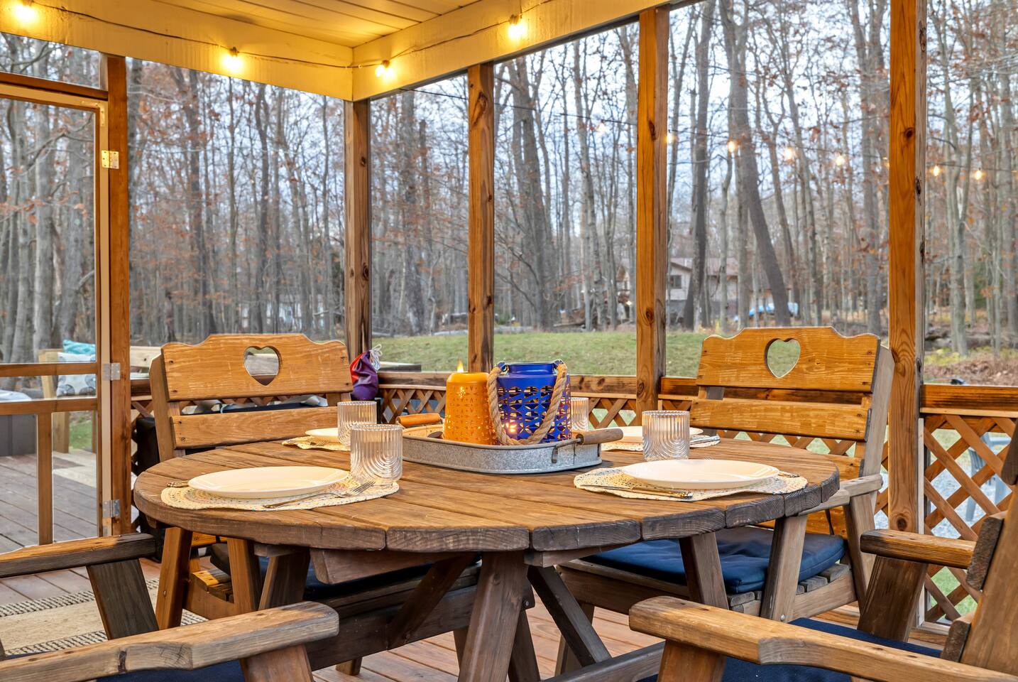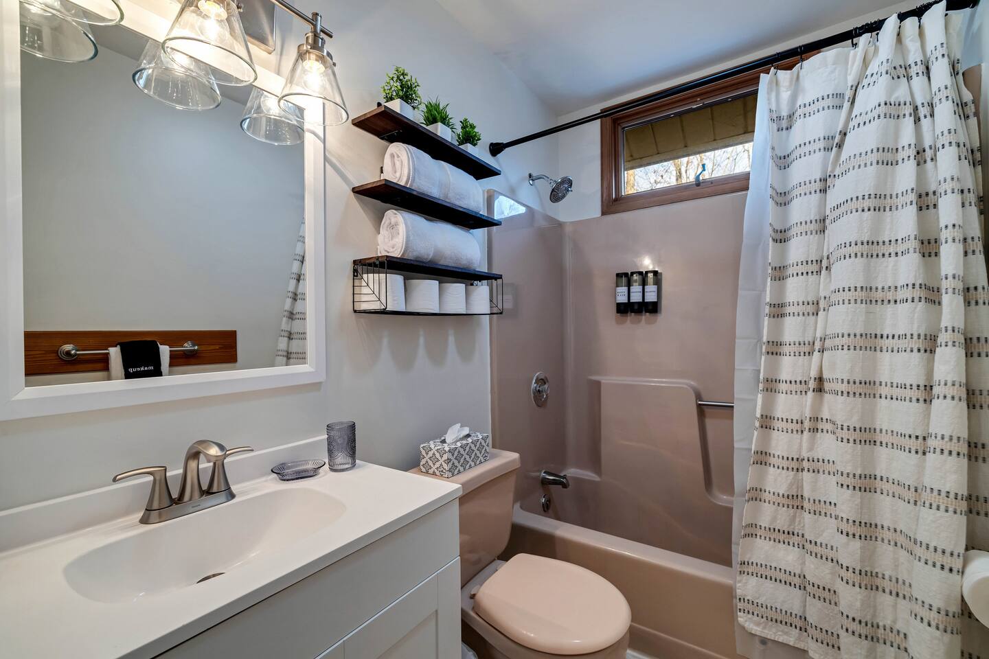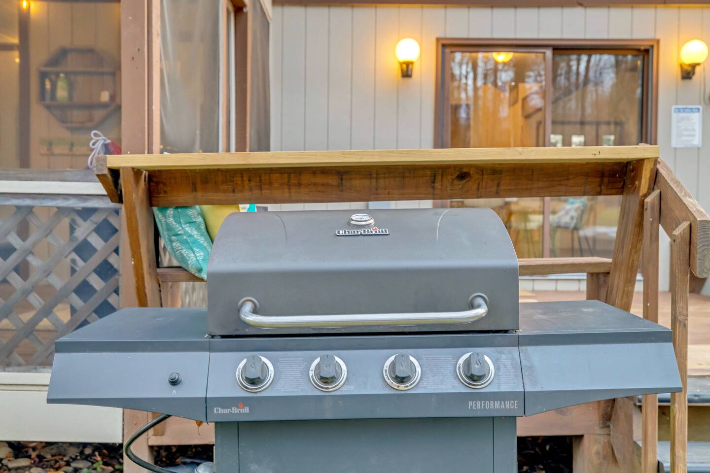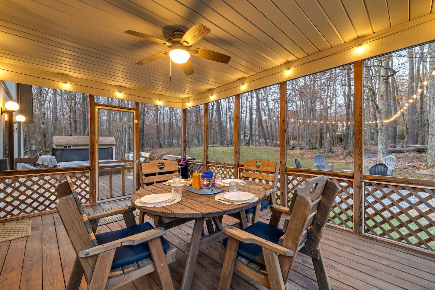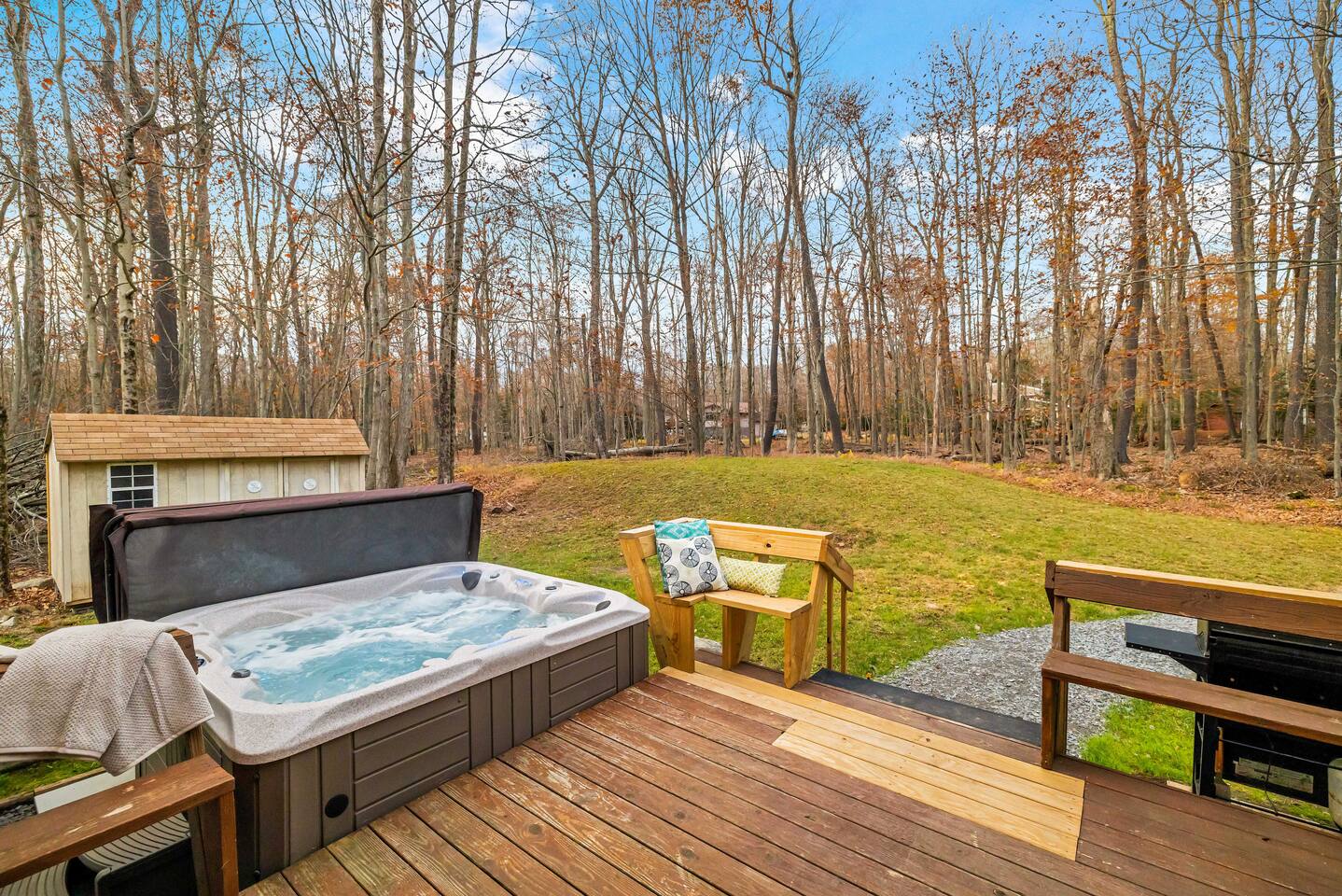 KEY FEATURES: ☀ Sleeps 8; 3 bedrooms, 2 queen, 4 twin bunks ☀ 2 Bathrooms; 1 full with combo shower/tub, 1 with shower only ☀ Well-equipped kitchen with seating for 6 guests ☀ Loft for additional space ☀ Roku entertainment systems throughout the home ☀ Board games and puzzles ☀ Dog-friendly ☀ Gorgeous forest views ☀ Back deck with grill ☀ Fire pit with some wood provided ☀ Private Hot Tub ☀ Short distance to Pocono Mt. attractions ☀6 miles from Jack Frost, Big Boulder Ski ☀13 miles from Kalahari ☀17 miles from Camelback Ski Resort ☀7 miles from Pocono Raceway ☆☆ BEDROOMS ☆☆ This clean and spacious hideaway accommodates 8 guests in 3 bedrooms The master bedroom is on the main level of the home and is fitted with a queen-size bed. The secondary bedroom features a queen-size bed as well. The third bedroom has two sets of bunk beds- all twin size. There are linens, extra blankets, and extra pillows so you don’t have to bring a thing with you to have a super comfortable night’s sleep! Please note: while the house sleeps 8, be mindful of bed sizes and be sure that the set up is appropriate for your group. TVs in all three rooms. ☆☆ BATHROOMS ☆☆ There are two full bathrooms, each of them stocked with the essentials you need for the duration of your stay. The first floor bathroom has a stall shower only and the second bathroom has a shower/tub combo. We provide a hair dryer, shampoo, conditioner, & body wash in each bathroom. There are also plenty of towels so you don't have to pack any! ☆☆ KITCHEN ☆☆ The kitchen is fully equipped with all the appliances, utensils and cookware you need to feel at home. The dining area seats 6 guests at the retro, mid-century modern table and there is additional seating available for groups over 6. We even have a high chair for our smallest guests to use! Enjoy your morning coffee or tea with our fully-stocked coffee bar. There's even a crockpot so you can make your favorite meals! ☆☆ OUTSIDE SPACE ☆☆ The exterior area of this home boasts a cozy fire pit with plenty of space for you to relax around. The back yard is large enough to bring everyone out to enjoy the beautiful Pocono outdoors! There is a screened-in porch so you can enjoy the outdoors in any weather. With a table and two outdoor couches, you have plenty of space to make yourself at home. The best part? There's a hot tub right off the deck for you to enjoy during your stay! Use our grill and make great memories hanging out at the house. If you want to venture out, you will have full access to the two lakes in the community as well as tennis and volleyball courts! You can go swimming or bring your fishing gear and see what you can catch. Use of community amenities is not guaranteed. Amenity availability is determined solely by the community/HOA and may change without notice. No refunds or discounts will be provided if amenities are unavailable during your stay. This home is located in a community with full-time residents. We aim to be respectful neighbors and kindly ask that you do the same. Quiet hours will be strictly observed and enforced.