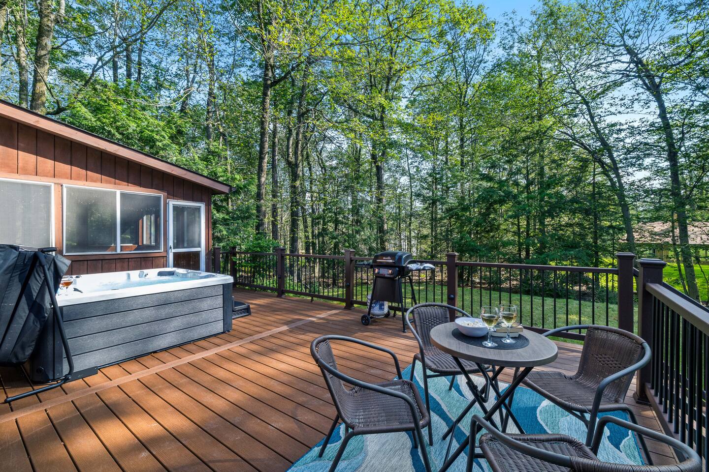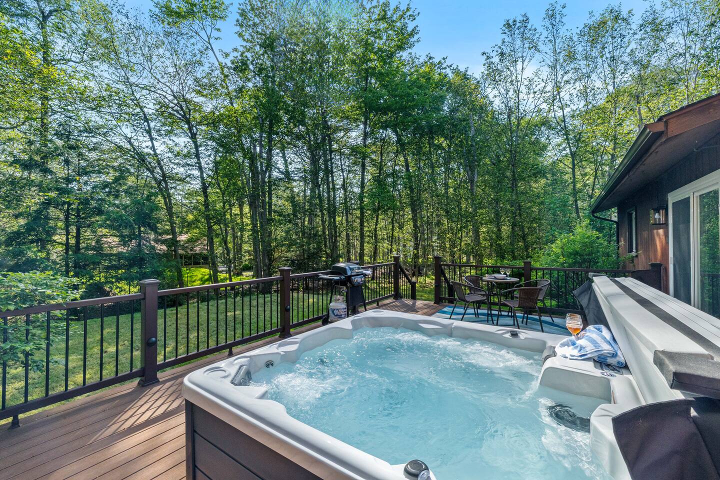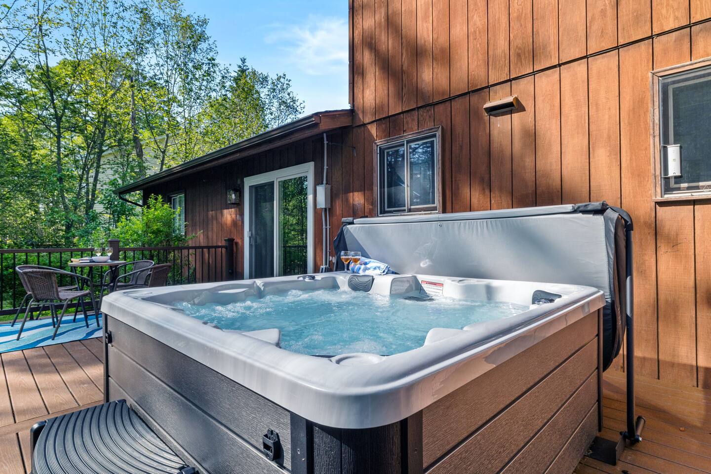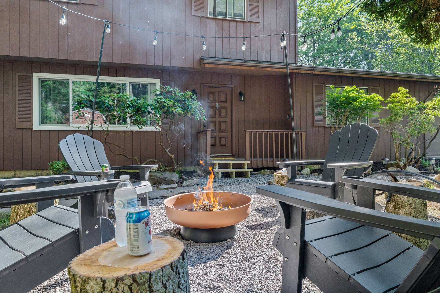 KEY FEATURES: ☀ Sleeps 8; 3 bedrooms, (2 queen, 3 twin beds, 1 twin trundle) ☀ 3 Bathrooms; 1 full with combo shower/tub, 1 with shower only,1 powder room ☀ Well-equipped kitchen with seating for 6 guests ☀ Smart TV ☀ Board games and puzzles ☀ Several video game consoles including arcade-style PacMan ☀ Dog-friendly ☀ Gorgeous forest views ☀ Back deck with grill ☀ Fire pit with some wood provided ☀ Private Hot Tub ☀ Short distance to Pocono Mt. attractions ☆☆ BEDROOMS ☆☆ This clean and spacious hideaway accommodates up to 8 guests in 3 bedrooms .The primary bedroom is on the second level of the home and is fitted with a King-size bed. The secondary bedroom features a queen-size bed as well. The third bedroom has a set of smaller bunk beds, and a twin sized bed with a trundle underneath. There are linens, extra blankets, and extra pillows so you don’t have to bring a thing with you to have a super comfortable night’s sleep! Please note: while the house sleeps 6, be mindful of bed sizes and be sure that the set up is appropriate for your group. ☆☆ BATHROOMS ☆☆ There are two full bathrooms and one powder room, each of them stocked with the essentials you need for the duration of your stay. The primary en-suite bathroom has a stall shower only and the second bathroom has a shower/tub combo. We provide a hair dryer, shampoo, conditioner, & body wash in each bathroom. There are also plenty of towels so you don't have to pack any! ☆☆ KITCHEN ☆☆ The kitchen is fully equipped with all the appliances, utensils and cookware you need to feel at home. The dining area seats 6 guests. We even have a high chair for our smallest guests to use! Enjoy your morning coffee or tea with our fully-stocked coffee bar. There's even a crockpot so you can make your favorite meals! ☆☆ OUTSIDE SPACE ☆☆ The exterior area of this home boasts a cozy fire pit with plenty of space for you to relax around. The back patio is large enough to bring everyone out to enjoy the beautiful Pocono outdoors! There is a screened-in porch so you can enjoy the outdoors in any weather. With two outdoor seating areas you have plenty of space to make yourself at home. The best part? There's a hot tub right on the deck for you to enjoy during your stay! Use our grill and make great memories hanging out at the house. This house, while in a great place to vacation, is also home to some full-time residents. We strive to be the best possible neighbors and ask that you please be respectful. Quiet hours will be strictly observed and enforced. ☆☆ THE COMMUNITY☆☆ This home is located in the beautiful and amenity-filled Pocono Farms Country Club. Amenity passes for 6 guests are included with your stay! Any guests over 6 will need to purchase passes on-site. COMMUNITY ACCESS/AMENITIES *Just a short 5 minute drive from the house!* Access to Glacier Lake & beach for kayaking, paddle boarding, and fishing Beach Volleyball Court Basketball Tennis and Pickle ball courts Bocce Ball/ Shuffleboard Olympic Size Outdoor Pool (seasonal) Seasonal entertainment events for every member of the family Access to a PGA Golf Course and fitness center are available for purchase but are not included in your amenity fee. This home is located in a community with full-time residents. We aim to be respectful neighbors and kindly ask that you do the same. Quiet hours will be strictly observed and enforced.