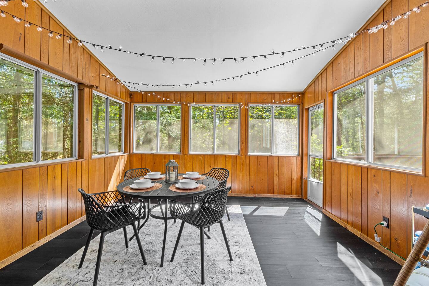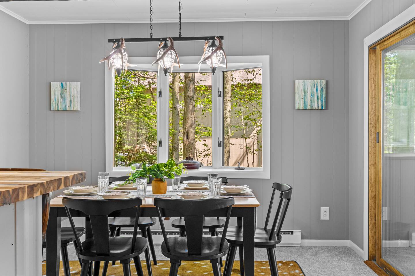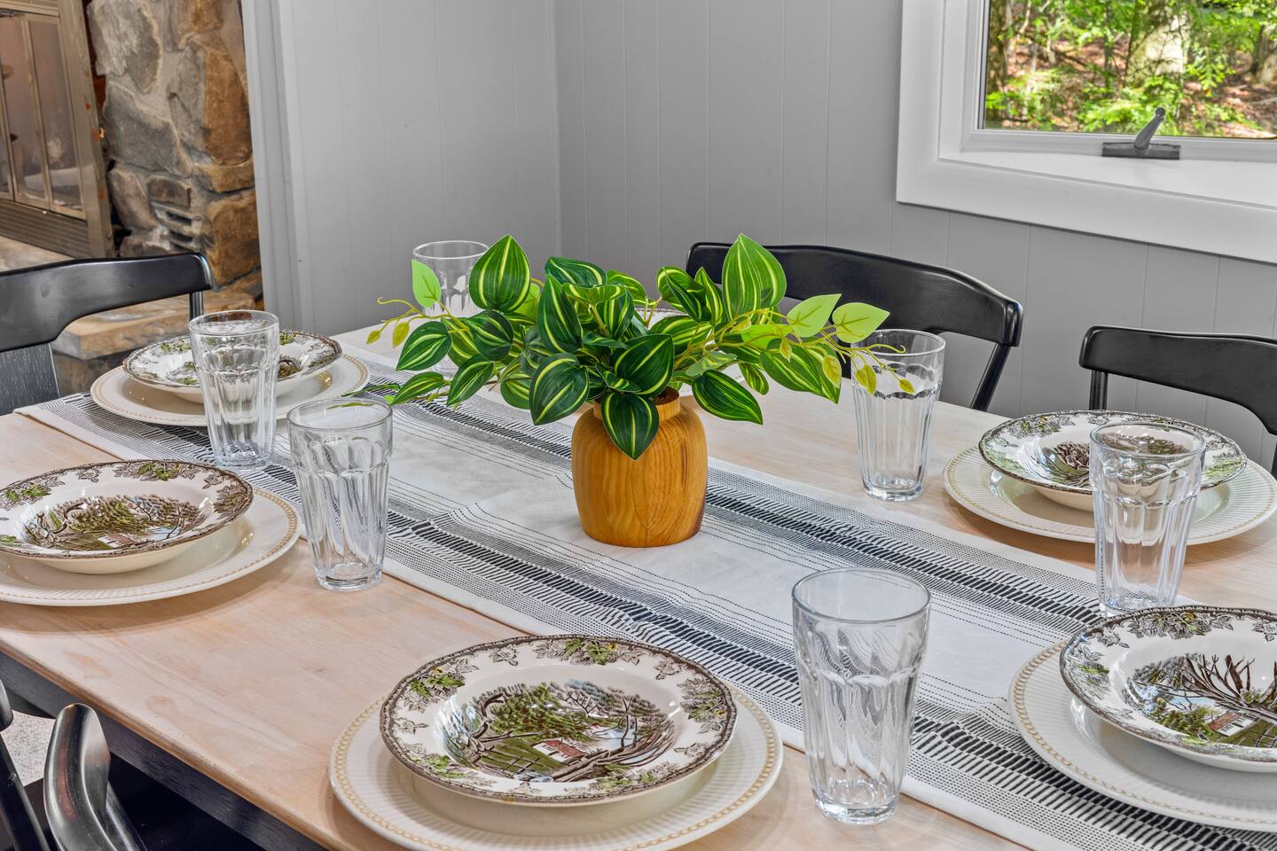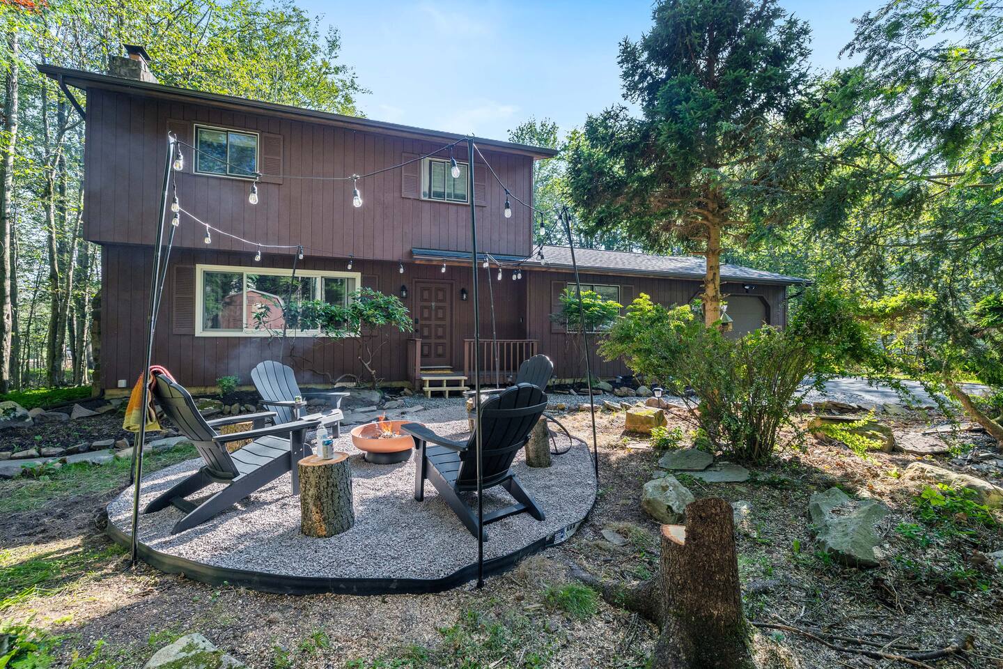 KEY FEATURES: ☀ Sleeps 8; 3 bedrooms, (2 queen, 3 twin beds, 1 twin trundle) ☀ 3 Bathrooms; 1 full with combo shower/tub, 1 with shower only,1 powder room ☀ Well-equipped kitchen with seating for 6 guests ☀ Smart TV ☀ Board games and puzzles ☀ Several video game consoles including arcade-style PacMan ☀ Dog-friendly ☀ Gorgeous forest views ☀ Back deck with grill ☀ Fire pit with some wood provided ☀ Private Hot Tub ☀ Short distance to Pocono Mt. attractions ☆☆ BEDROOMS ☆☆ This clean and spacious hideaway accommodates up to 8 guests in 3 bedrooms .The primary bedroom is on the second level of the home and is fitted with a King-size bed. The secondary bedroom features a queen-size bed as well. The third bedroom has a set of smaller bunk beds, and a twin sized bed with a trundle underneath. There are linens, extra blankets, and extra pillows so you don’t have to bring a thing with you to have a super comfortable night’s sleep! Please note: while the house sleeps 6, be mindful of bed sizes and be sure that the set up is appropriate for your group. ☆☆ BATHROOMS ☆☆ There are two full bathrooms and one powder room, each of them stocked with the essentials you need for the duration of your stay. The primary en-suite bathroom has a stall shower only and the second bathroom has a shower/tub combo. We provide a hair dryer, shampoo, conditioner, & body wash in each bathroom. There are also plenty of towels so you don't have to pack any! ☆☆ KITCHEN ☆☆ The kitchen is fully equipped with all the appliances, utensils and cookware you need to feel at home. The dining area seats 6 guests. We even have a high chair for our smallest guests to use! Enjoy your morning coffee or tea with our fully-stocked coffee bar. There's even a crockpot so you can make your favorite meals! ☆☆ OUTSIDE SPACE ☆☆ The exterior area of this home boasts a cozy fire pit with plenty of space for you to relax around. The back patio is large enough to bring everyone out to enjoy the beautiful Pocono outdoors! There is a screened-in porch so you can enjoy the outdoors in any weather. With two outdoor seating areas you have plenty of space to make yourself at home. The best part? There's a hot tub right on the deck for you to enjoy during your stay! Use our grill and make great memories hanging out at the house. This house, while in a great place to vacation, is also home to some full-time residents. We strive to be the best possible neighbors and ask that you please be respectful. Quiet hours will be strictly observed and enforced. ☆☆ THE COMMUNITY☆☆ This home is located in the beautiful and amenity-filled Pocono Farms Country Club. Amenity passes for 6 guests are included with your stay! Any guests over 6 will need to purchase passes on-site. COMMUNITY ACCESS/AMENITIES *Just a short 5 minute drive from the house!* Access to Glacier Lake & beach for kayaking, paddle boarding, and fishing Beach Volleyball Court Basketball Tennis and Pickle ball courts Bocce Ball/ Shuffleboard Olympic Size Outdoor Pool (seasonal) Seasonal entertainment events for every member of the family Access to a PGA Golf Course and fitness center are available for purchase but are not included in your amenity fee. This home is located in a community with full-time residents. We aim to be respectful neighbors and kindly ask that you do the same. Quiet hours will be strictly observed and enforced.