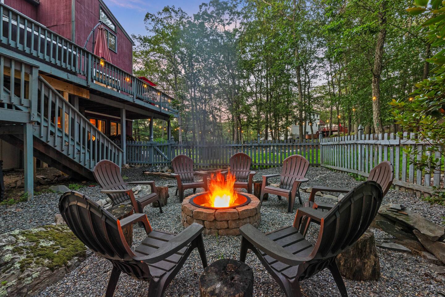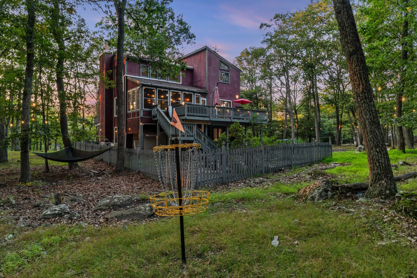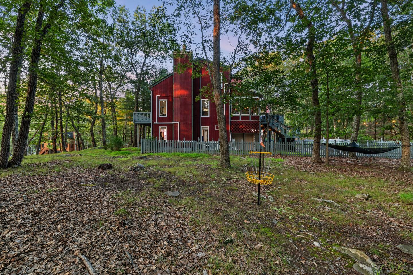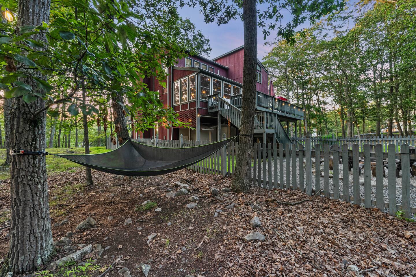 KEY FEATURES: ☀ Sleeps 12; 5 bedrooms, 1 King, 3 queen, 1 set of bunks (full and twin sized), full sized futon ☀ 3 Full Bathrooms-2 bath tubs/1 stall shower ☀ Well-equipped kitchen with seating for 12 guests ☀ Smart TVs throughout the home ☀ Board games and puzzles ☀ Dog-friendly ☀ Gorgeous forest views with giant backyard ☀ Back deck with grill and private hot tub ☀ Fire pit with wood provided ☀ Screened in porch with gas fire pit ☀ Short distance to all Pocono attractions ☀ 2 disc golf holes ☀ Game room with multi-function game table ☀Full access to Penn Estates amenities including pool and lake ☆☆ BEDROOMS ☆☆ This extremely spacious getaway accommodates 12 guests in 5 bedrooms The master bedroom is on the main level of the home and is fitted with a King-size bed. The secondary floor has 3 bedrooms- 2 queen size, 1 set of bunks with a twin and full bed, and a full sized futon. The bottom floor has the house's last bedroom with a queen sized bed. There are linens, extra blankets, and extra pillows so you don’t have to bring a thing with you to have a super comfortable night’s sleep! TVs in all rooms. ☆☆ BATHROOMS ☆☆ There are three full bathrooms, each of them stocked with the essentials you need for the duration of your stay. The primary bathroom contains a stall shower and massive bath tub for relaxing. The second floor has a full bathroom with tub/shower combo. The bottom floor has a stall shower only. We provide a hair dryer, shampoo, conditioner, & body wash in each bathroom. There are also plenty of towels so you don't have to pack any! ☆☆ KITCHEN ☆☆ The kitchen is fully equipped with all the appliances, utensils and cookware you need to feel at home. The dining area seats 8 guests at the formal dining table and there is additional seating available in the kitchen for 4 more. We even have a high chair for our smallest guests to use! Enjoy your morning coffee or tea with our fully-stocked coffee bar. ☆☆ OUTSIDE SPACE ☆☆ The exterior area of this home is huge and is perfect for larger groups to come and have enough space to spread out. It boasts a cozy fire pit with plenty of space for you to relax around. There are 2 disc golf holes, a hammock, private hot tub, and tons of outdoor games. There is a screened-in porch so you can enjoy the outdoors in any weather. There's outdoor seating on couches and chairs and a propane fire pit. The best part? There's a hot tub right on the deck for you to enjoy during your stay! Use our grill and make great memories hanging out at the house. You will also have full access to the Penn Estates amenities including lake and pool! Amenity passes are provided as part of your stay. Use of community amenities is not guaranteed. Amenity availability is determined solely by the community/HOA and may change without notice. No refunds or discounts will be provided if amenities are unavailable during your stay. This home is located in a community with full-time residents. We aim to be respectful neighbors and kindly ask that you do the same. Quiet hours will be strictly observed and enforced.