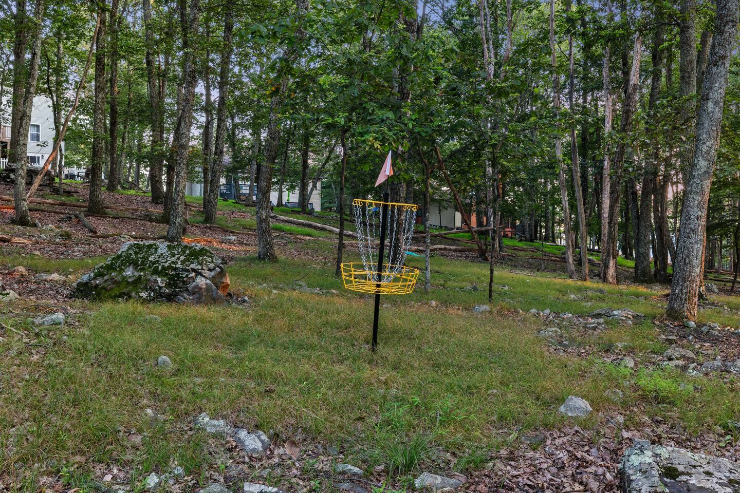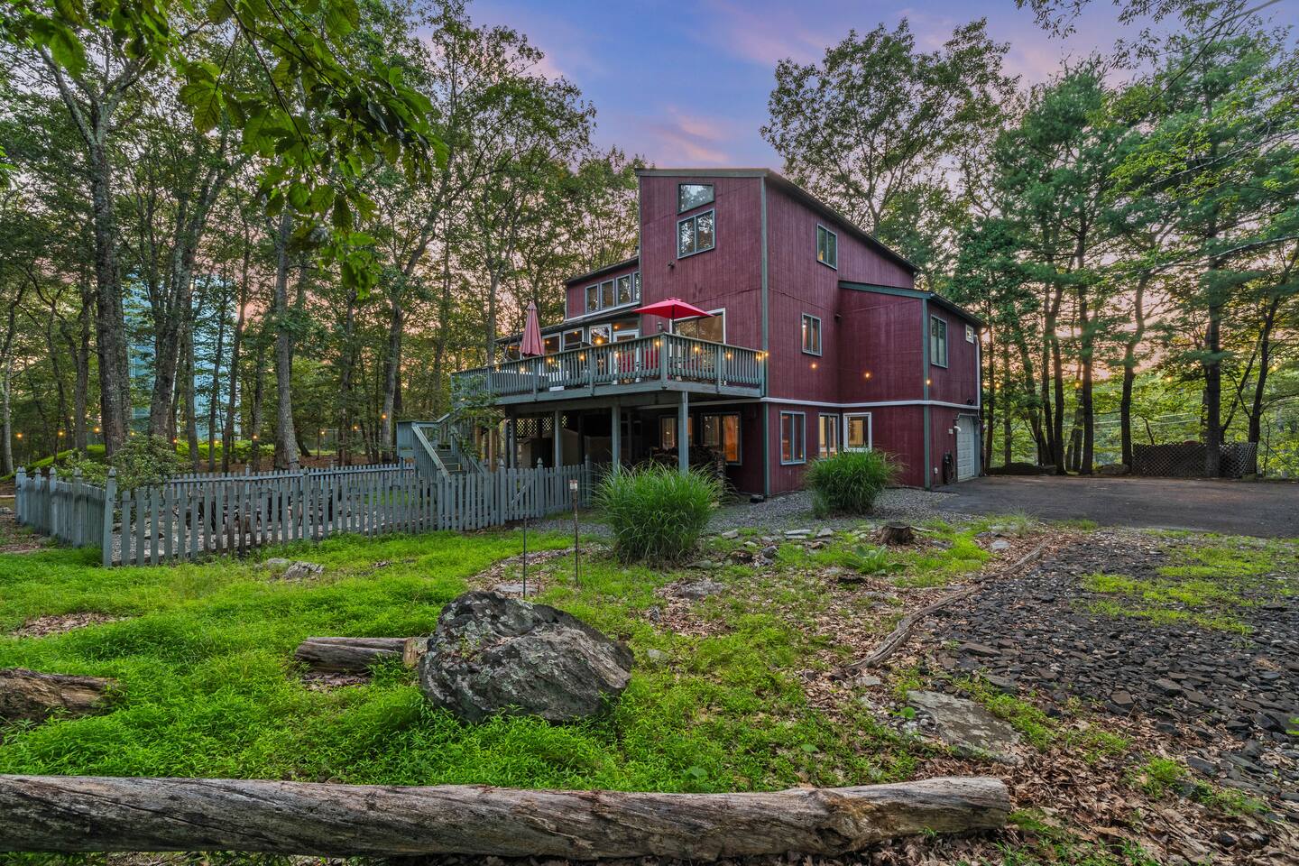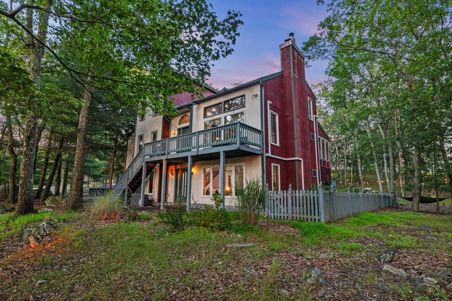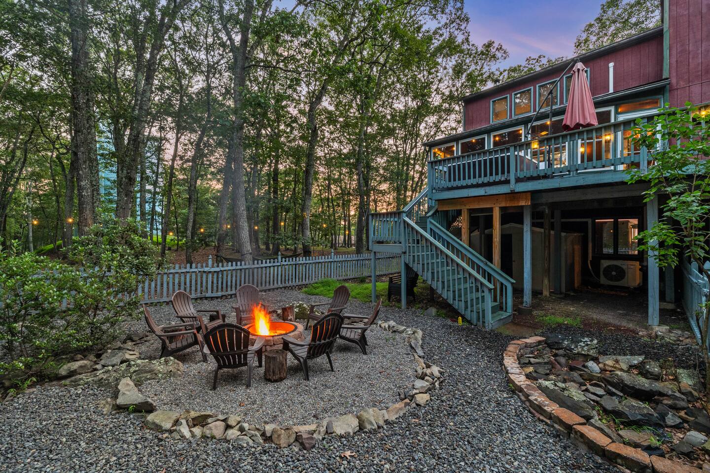 KEY FEATURES: ☀ Sleeps 12; 5 bedrooms, 1 King, 3 queen, 1 set of bunks (full and twin sized), full sized futon ☀ 3 Full Bathrooms-2 bath tubs/1 stall shower ☀ Well-equipped kitchen with seating for 12 guests ☀ Smart TVs throughout the home ☀ Board games and puzzles ☀ Dog-friendly ☀ Gorgeous forest views with giant backyard ☀ Back deck with grill and private hot tub ☀ Fire pit with wood provided ☀ Screened in porch with gas fire pit ☀ Short distance to all Pocono attractions ☀ 2 disc golf holes ☀ Game room with multi-function game table ☀Full access to Penn Estates amenities including pool and lake ☆☆ BEDROOMS ☆☆ This extremely spacious getaway accommodates 12 guests in 5 bedrooms The master bedroom is on the main level of the home and is fitted with a King-size bed. The secondary floor has 3 bedrooms- 2 queen size, 1 set of bunks with a twin and full bed, and a full sized futon. The bottom floor has the house's last bedroom with a queen sized bed. There are linens, extra blankets, and extra pillows so you don’t have to bring a thing with you to have a super comfortable night’s sleep! TVs in all rooms. ☆☆ BATHROOMS ☆☆ There are three full bathrooms, each of them stocked with the essentials you need for the duration of your stay. The primary bathroom contains a stall shower and massive bath tub for relaxing. The second floor has a full bathroom with tub/shower combo. The bottom floor has a stall shower only. We provide a hair dryer, shampoo, conditioner, & body wash in each bathroom. There are also plenty of towels so you don't have to pack any! ☆☆ KITCHEN ☆☆ The kitchen is fully equipped with all the appliances, utensils and cookware you need to feel at home. The dining area seats 8 guests at the formal dining table and there is additional seating available in the kitchen for 4 more. We even have a high chair for our smallest guests to use! Enjoy your morning coffee or tea with our fully-stocked coffee bar. ☆☆ OUTSIDE SPACE ☆☆ The exterior area of this home is huge and is perfect for larger groups to come and have enough space to spread out. It boasts a cozy fire pit with plenty of space for you to relax around. There are 2 disc golf holes, a hammock, private hot tub, and tons of outdoor games. There is a screened-in porch so you can enjoy the outdoors in any weather. There's outdoor seating on couches and chairs and a propane fire pit. The best part? There's a hot tub right on the deck for you to enjoy during your stay! Use our grill and make great memories hanging out at the house. You will also have full access to the Penn Estates amenities including lake and pool! Amenity passes are provided as part of your stay. Use of community amenities is not guaranteed. Amenity availability is determined solely by the community/HOA and may change without notice. No refunds or discounts will be provided if amenities are unavailable during your stay. This home is located in a community with full-time residents. We aim to be respectful neighbors and kindly ask that you do the same. Quiet hours will be strictly observed and enforced.