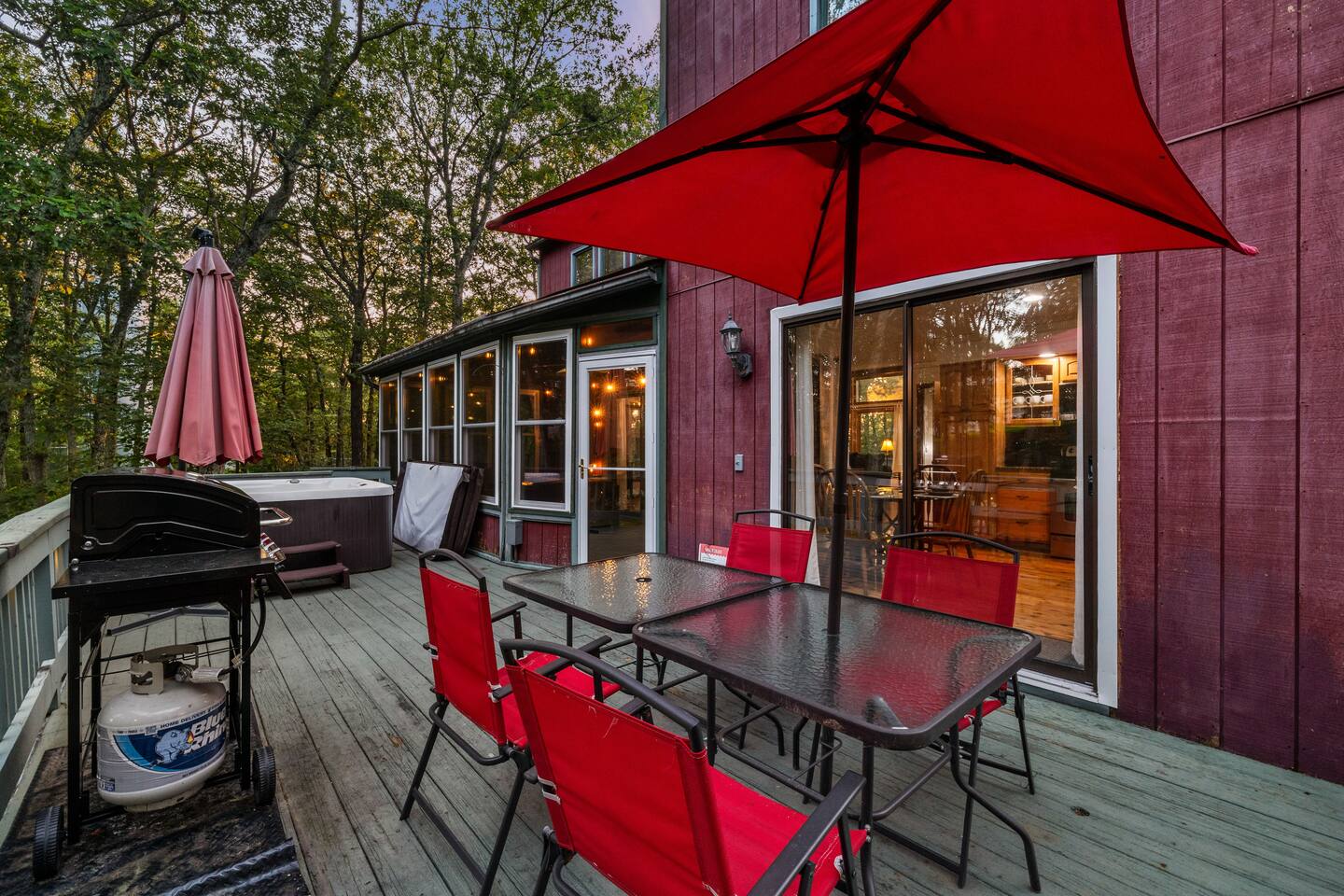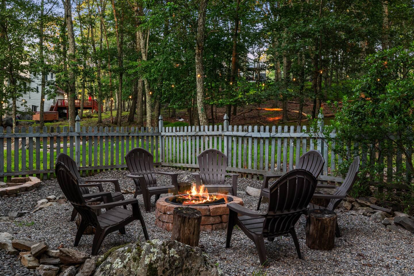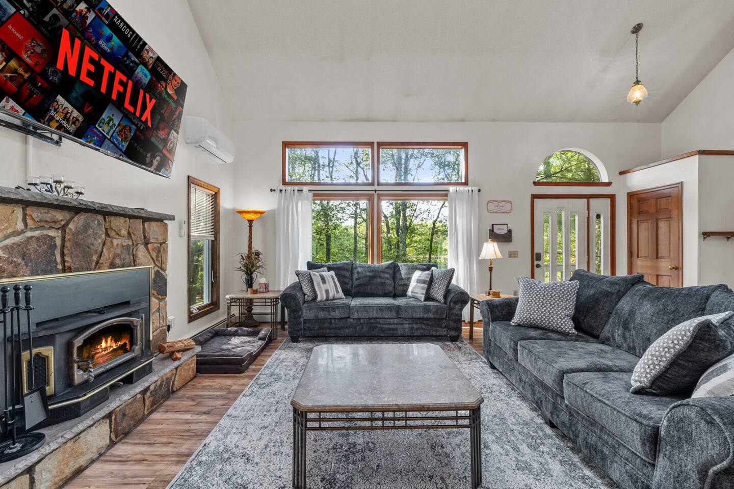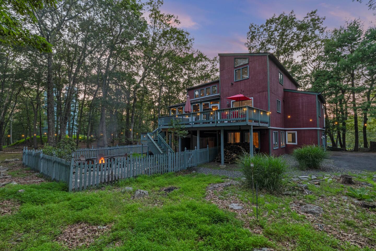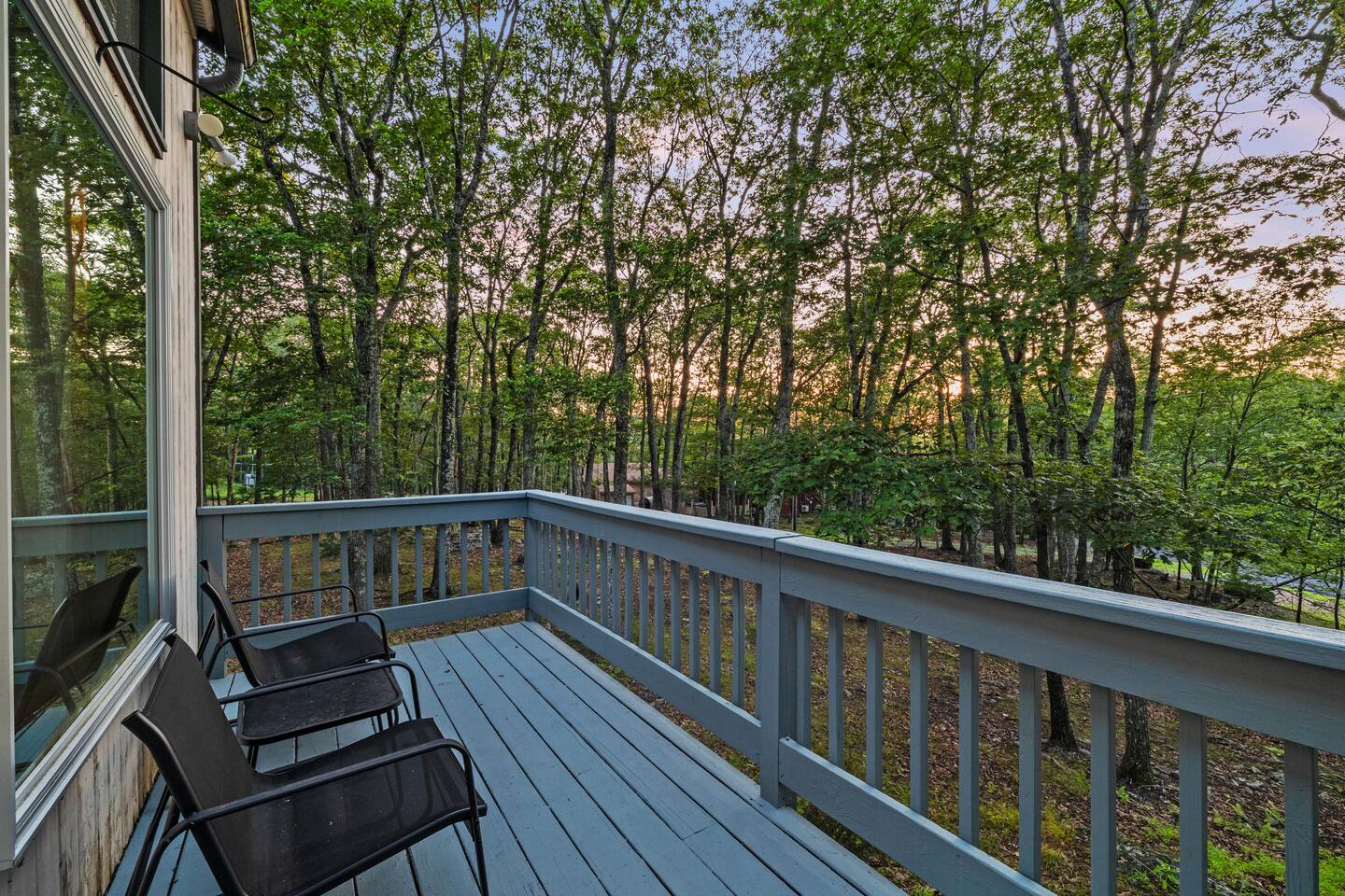 KEY FEATURES: ☀ Sleeps 12; 5 bedrooms, 1 King, 3 queen, 1 set of bunks (full and twin sized), full sized futon ☀ 3 Full Bathrooms-2 bath tubs/1 stall shower ☀ Well-equipped kitchen with seating for 12 guests ☀ Smart TVs throughout the home ☀ Board games and puzzles ☀ Dog-friendly ☀ Gorgeous forest views with giant backyard ☀ Back deck with grill and private hot tub ☀ Fire pit with wood provided ☀ Screened in porch with gas fire pit ☀ Short distance to all Pocono attractions ☀ 2 disc golf holes ☀ Game room with multi-function game table ☀Full access to Penn Estates amenities including pool and lake ☆☆ BEDROOMS ☆☆ This extremely spacious getaway accommodates 12 guests in 5 bedrooms The master bedroom is on the main level of the home and is fitted with a King-size bed. The secondary floor has 3 bedrooms- 2 queen size, 1 set of bunks with a twin and full bed, and a full sized futon. The bottom floor has the house's last bedroom with a queen sized bed. There are linens, extra blankets, and extra pillows so you don’t have to bring a thing with you to have a super comfortable night’s sleep! TVs in all rooms. ☆☆ BATHROOMS ☆☆ There are three full bathrooms, each of them stocked with the essentials you need for the duration of your stay. The primary bathroom contains a stall shower and massive bath tub for relaxing. The second floor has a full bathroom with tub/shower combo. The bottom floor has a stall shower only. We provide a hair dryer, shampoo, conditioner, & body wash in each bathroom. There are also plenty of towels so you don't have to pack any! ☆☆ KITCHEN ☆☆ The kitchen is fully equipped with all the appliances, utensils and cookware you need to feel at home. The dining area seats 8 guests at the formal dining table and there is additional seating available in the kitchen for 4 more. We even have a high chair for our smallest guests to use! Enjoy your morning coffee or tea with our fully-stocked coffee bar. ☆☆ OUTSIDE SPACE ☆☆ The exterior area of this home is huge and is perfect for larger groups to come and have enough space to spread out. It boasts a cozy fire pit with plenty of space for you to relax around. There are 2 disc golf holes, a hammock, private hot tub, and tons of outdoor games. There is a screened-in porch so you can enjoy the outdoors in any weather. There's outdoor seating on couches and chairs and a propane fire pit. The best part? There's a hot tub right on the deck for you to enjoy during your stay! Use our grill and make great memories hanging out at the house. You will also have full access to the Penn Estates amenities including lake and pool! Amenity passes are provided as part of your stay. Use of community amenities is not guaranteed. Amenity availability is determined solely by the community/HOA and may change without notice. No refunds or discounts will be provided if amenities are unavailable during your stay. This home is located in a community with full-time residents. We aim to be respectful neighbors and kindly ask that you do the same. Quiet hours will be strictly observed and enforced.