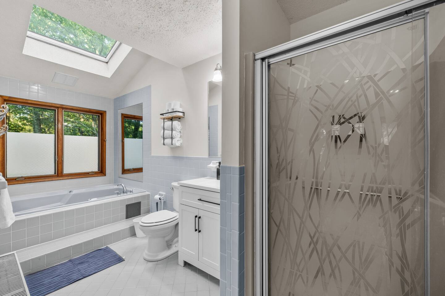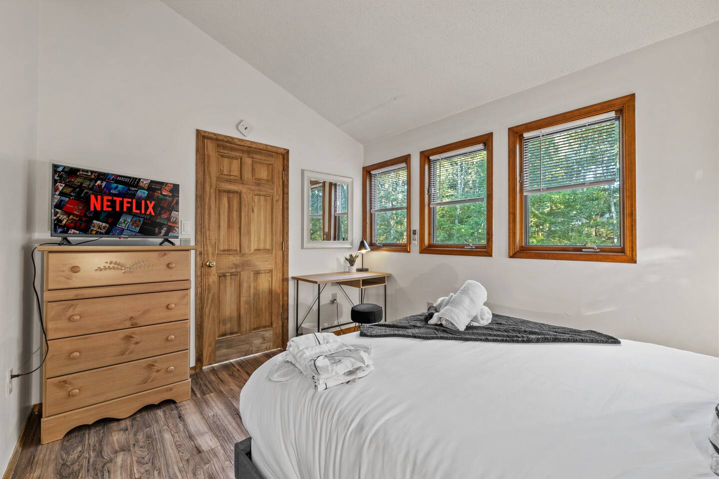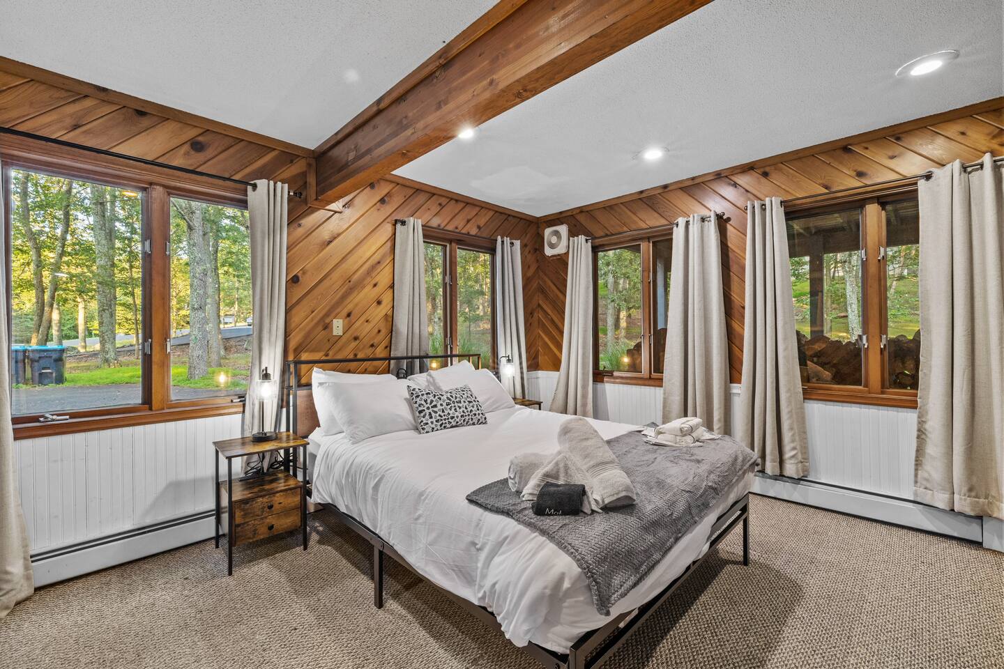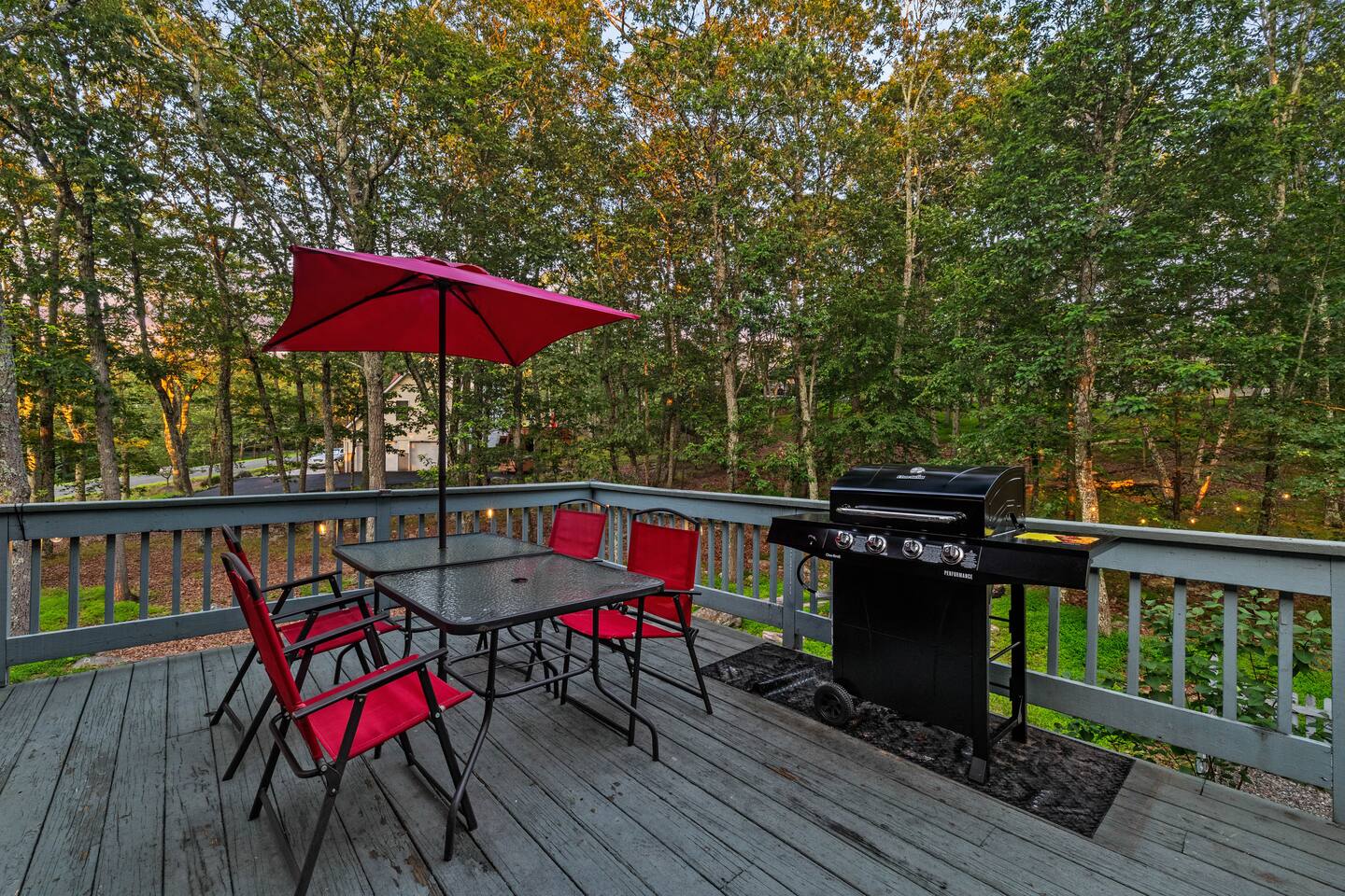 KEY FEATURES: ☀ Sleeps 12; 5 bedrooms, 1 King, 3 queen, 1 set of bunks (full and twin sized), full sized futon ☀ 3 Full Bathrooms-2 bath tubs/1 stall shower ☀ Well-equipped kitchen with seating for 12 guests ☀ Smart TVs throughout the home ☀ Board games and puzzles ☀ Dog-friendly ☀ Gorgeous forest views with giant backyard ☀ Back deck with grill and private hot tub ☀ Fire pit with wood provided ☀ Screened in porch with gas fire pit ☀ Short distance to all Pocono attractions ☀ 2 disc golf holes ☀ Game room with multi-function game table ☀Full access to Penn Estates amenities including pool and lake ☆☆ BEDROOMS ☆☆ This extremely spacious getaway accommodates 12 guests in 5 bedrooms The master bedroom is on the main level of the home and is fitted with a King-size bed. The secondary floor has 3 bedrooms- 2 queen size, 1 set of bunks with a twin and full bed, and a full sized futon. The bottom floor has the house's last bedroom with a queen sized bed. There are linens, extra blankets, and extra pillows so you don’t have to bring a thing with you to have a super comfortable night’s sleep! TVs in all rooms. ☆☆ BATHROOMS ☆☆ There are three full bathrooms, each of them stocked with the essentials you need for the duration of your stay. The primary bathroom contains a stall shower and massive bath tub for relaxing. The second floor has a full bathroom with tub/shower combo. The bottom floor has a stall shower only. We provide a hair dryer, shampoo, conditioner, & body wash in each bathroom. There are also plenty of towels so you don't have to pack any! ☆☆ KITCHEN ☆☆ The kitchen is fully equipped with all the appliances, utensils and cookware you need to feel at home. The dining area seats 8 guests at the formal dining table and there is additional seating available in the kitchen for 4 more. We even have a high chair for our smallest guests to use! Enjoy your morning coffee or tea with our fully-stocked coffee bar. ☆☆ OUTSIDE SPACE ☆☆ The exterior area of this home is huge and is perfect for larger groups to come and have enough space to spread out. It boasts a cozy fire pit with plenty of space for you to relax around. There are 2 disc golf holes, a hammock, private hot tub, and tons of outdoor games. There is a screened-in porch so you can enjoy the outdoors in any weather. There's outdoor seating on couches and chairs and a propane fire pit. The best part? There's a hot tub right on the deck for you to enjoy during your stay! Use our grill and make great memories hanging out at the house. You will also have full access to the Penn Estates amenities including lake and pool! Amenity passes are provided as part of your stay. Use of community amenities is not guaranteed. Amenity availability is determined solely by the community/HOA and may change without notice. No refunds or discounts will be provided if amenities are unavailable during your stay. This home is located in a community with full-time residents. We aim to be respectful neighbors and kindly ask that you do the same. Quiet hours will be strictly observed and enforced.