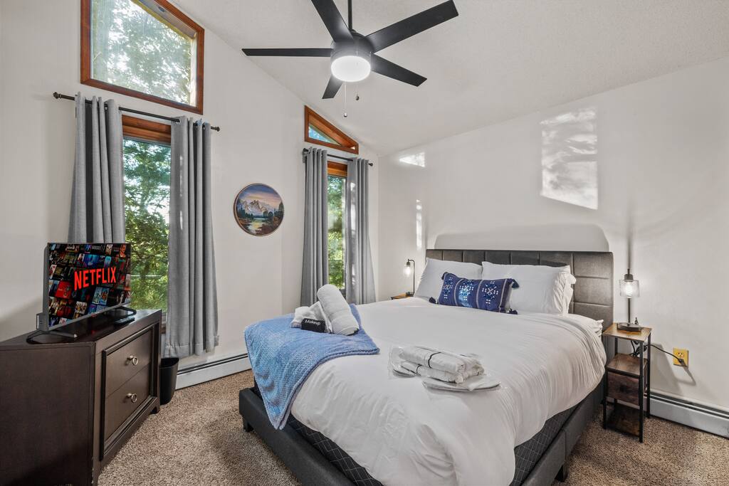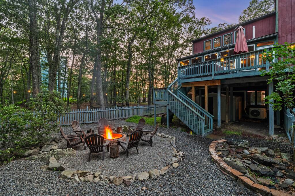 KEY FEATURES: ☀ Sleeps 12; 5 bedrooms, 1 King, 3 queen, 1 set of bunks (full and twin sized), full sized futon ☀ 3 Full Bathrooms-2 bath tubs/1 stall shower ☀ Well-equipped kitchen with seating for 12 guests ☀ Smart TVs throughout the home ☀ Board games and puzzles ☀ Dog-friendly ☀ Gorgeous forest views with giant backyard ☀ Back deck with grill and private hot tub ☀ Fire pit with wood provided ☀ Screened in porch with gas fire pit ☀ Short distance to all Pocono attractions ☀ Private indoor sauna ☀ 2 disc golf holes ☀ Game room with multi-function game table ☀Full access to Penn Estates amenities including pool and lake ☆☆ BEDROOMS ☆☆ This extremely spacious getaway accommodates 12 guests in 5 bedrooms The master bedroom is on the main level of the home and is fitted with a King-size bed. The secondary floor has 3 bedrooms- 2 queen size, 1 set of bunks with a twin and full bed, and a full sized futon. The bottom floor has the house's last bedroom with a queen sized bed. There are linens, extra blankets, and extra pillows so you don’t have to bring a thing with you to have a super comfortable night’s sleep! TVs in all rooms. ☆☆ BATHROOMS ☆☆ There are three full bathrooms, each of them stocked with the essentials you need for the duration of your stay. The primary bathroom contains a stall shower and massive bath tub for relaxing. The second floor has a full bathroom with tub/shower combo. The bottom floor has a stall shower only. We provide a hair dryer, shampoo, conditioner, & body wash in each bathroom. There are also plenty of towels so you don't have to pack any! ☆☆ KITCHEN ☆☆ The kitchen is fully equipped with all the appliances, utensils and cookware you need to feel at home. The dining area seats 8 guests at the formal dining table and there is additional seating available in the kitchen for 4 more. We even have a high chair for our smallest guests to use! Enjoy your morning coffee or tea with our fully-stocked coffee bar. ☆☆ OUTSIDE SPACE ☆☆ The exterior area of this home is huge and is perfect for larger groups to come and have enough space to spread out. It boasts a cozy fire pit with plenty of space for you to relax around. There are 2 disc golf holes, a hammock, private hot tub, and tons of outdoor games. There is a screened-in porch so you can enjoy the outdoors in any weather. There's outdoor seating on couches and chairs and a propane fire pit. The best part? There's a hot tub right on the deck for you to enjoy during your stay! Use our grill and make great memories hanging out at the house. You will also have full access to the Penn Estates amenities including lake and pool! Amenity passes are provided as part of your stay. This house, while in a great place to vacation, is also home to some full-time residents. We strive to be the best possible neighbors and ask that you please be respectful. Quiet hours will be strictly observed and enforced.